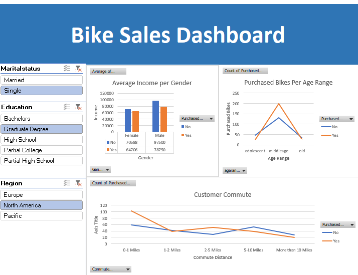 Built an Excel dashboard analyzing bike sales by marital status, education level, and region. Enabled quick filtering and trend discovery through interactive charts and slicers.